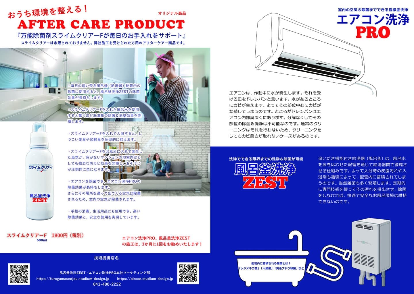 アフターケアに、弊社オリジナルグッズ≪ジャームキラーJr≫ を使えば、ふろ水の除菌&防臭、浴室内の防カビ、洗濯水の除菌&防臭、洗濯槽の除菌&防臭だけではなく、毎日のエアコンの除菌も可能です。つまりおうちの浴室環境の大幅な改善だけではなく、洗濯問題、お部屋の空気問題全てを快適にできるのです!